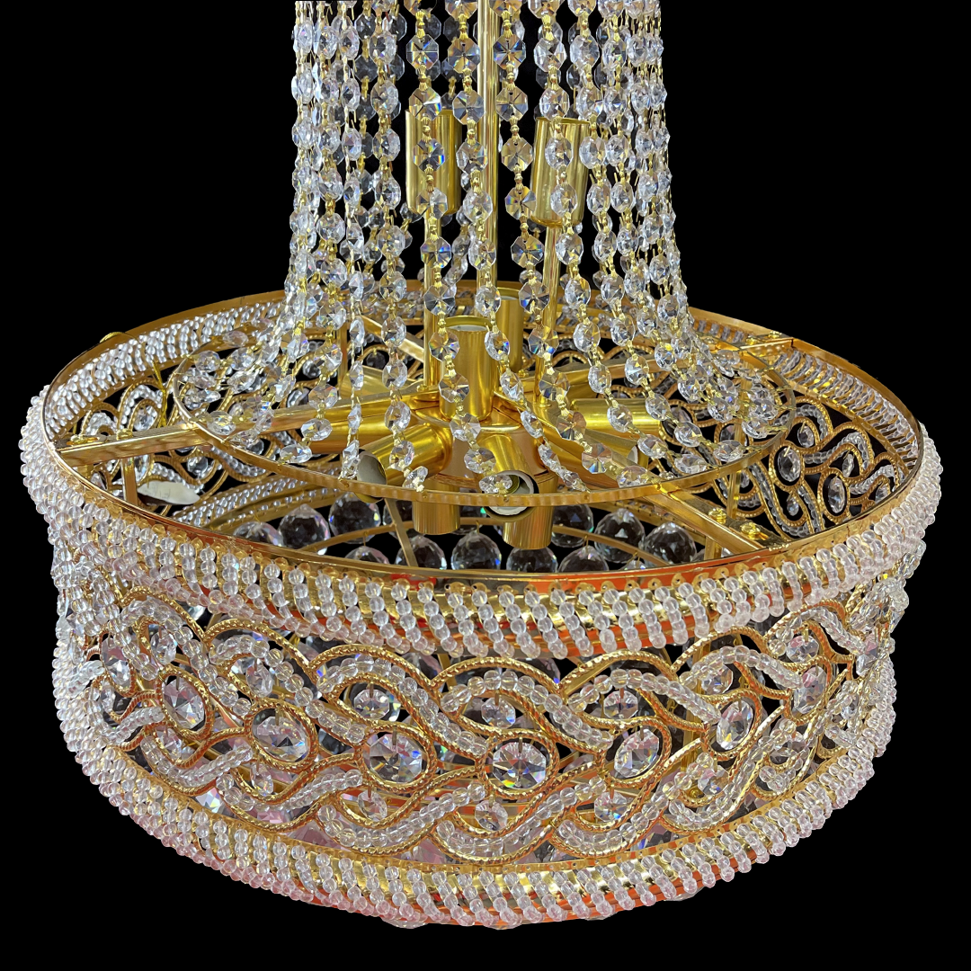 Candelabrul din cristal CC718/400 impresioneaza prin designul sau opulent si finisajul auriu lucios, ideal pentru interioare luxoase. Cu 11 socluri E14 si numeroase elemente de cristal fatetat, ofera un spectacol de lumini si reflexii, transformand orice spatiu intr-o incapere eleganta. ✔ Tip soclu: 11x E14 (becuri inlocuibile) ✔ Dimensiuni: Diametru 40 cm ✔ Material: Metal + Cristal ✔ Finisaj: Auriu lucios ✔ Utilizare: Living, dining, holuri, restaurante, hoteluri si spatii premium Un candelabru impunator, perfect pentru a deveni punctul central al incaperii, aducand stralucire, rafinament si prestigiu.