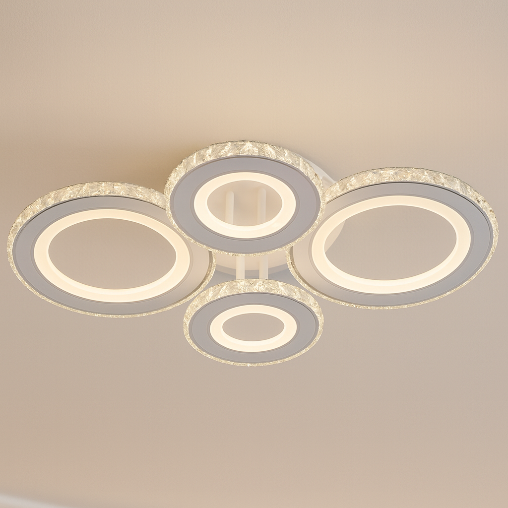 Lustra LED cu telecomanda si cristal NOVA ROTONDA RGB 82W, 4 Cercuri, lumina Rece/Calda/Neutra, Dimabila, Alb