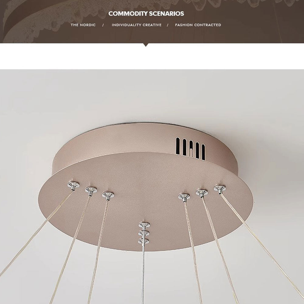 Modelul NIVALIS se remarca prin textura in relief a inelelor acrilice, ce aduce aminte de sticla topita sau forme naturale sculptate in valuri. Este o lustra LED cu telecomanda, cu doua cercuri suspendate si un diametru generos 60 cm, ideala pentru living, zona de dining sau dormitor. Cu 126W si un flux luminos de 10080 lumeni, ofera iluminare consistenta in spatii medii spre mari. Lumina poate fi comutata intre calda, neutra si rece (3000K, 4000K, 6000K), iar intensitatea este dimabila, controlata din telecomanda sau de la intrerupatorul clasic. Designul circular, suspendat pe fire subtiri reglabile, adauga un accent sculptural care atrage privirea fara sa incarce tavanul. Functioneaza cu banda LED, are autonomie de 25.000 ore si un finisaj auriu mat, usor de integrat in amenajari contemporane.