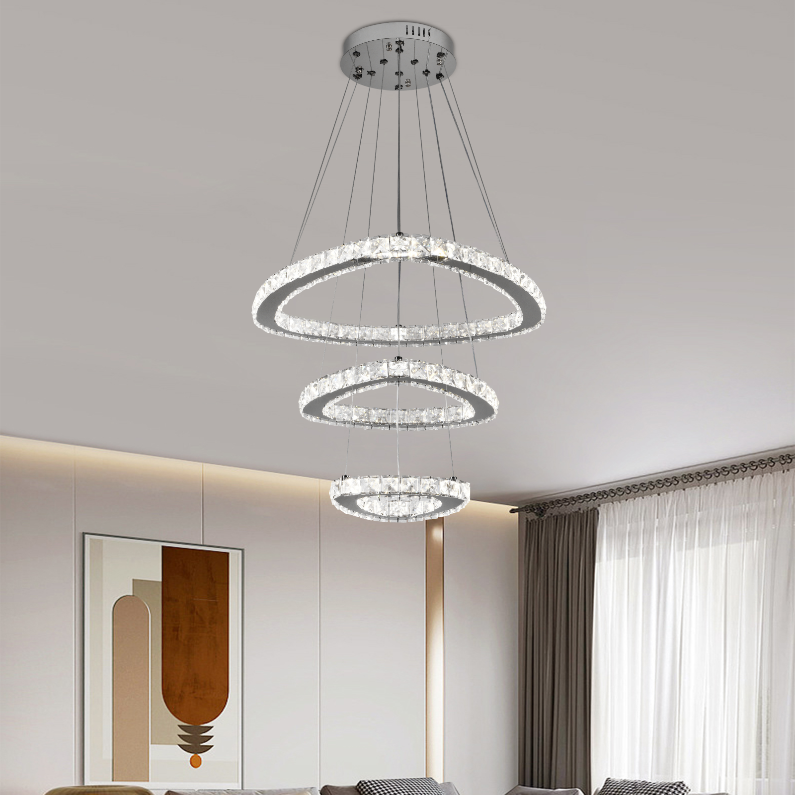 Lustra LED suspendata cu telecomanda si cristal PRISM LUMORA 63W, 3 Cercuri, lumina Rece/Calda/Neutra, Dimabila, Crom Lucios, Inaltime Reglabila