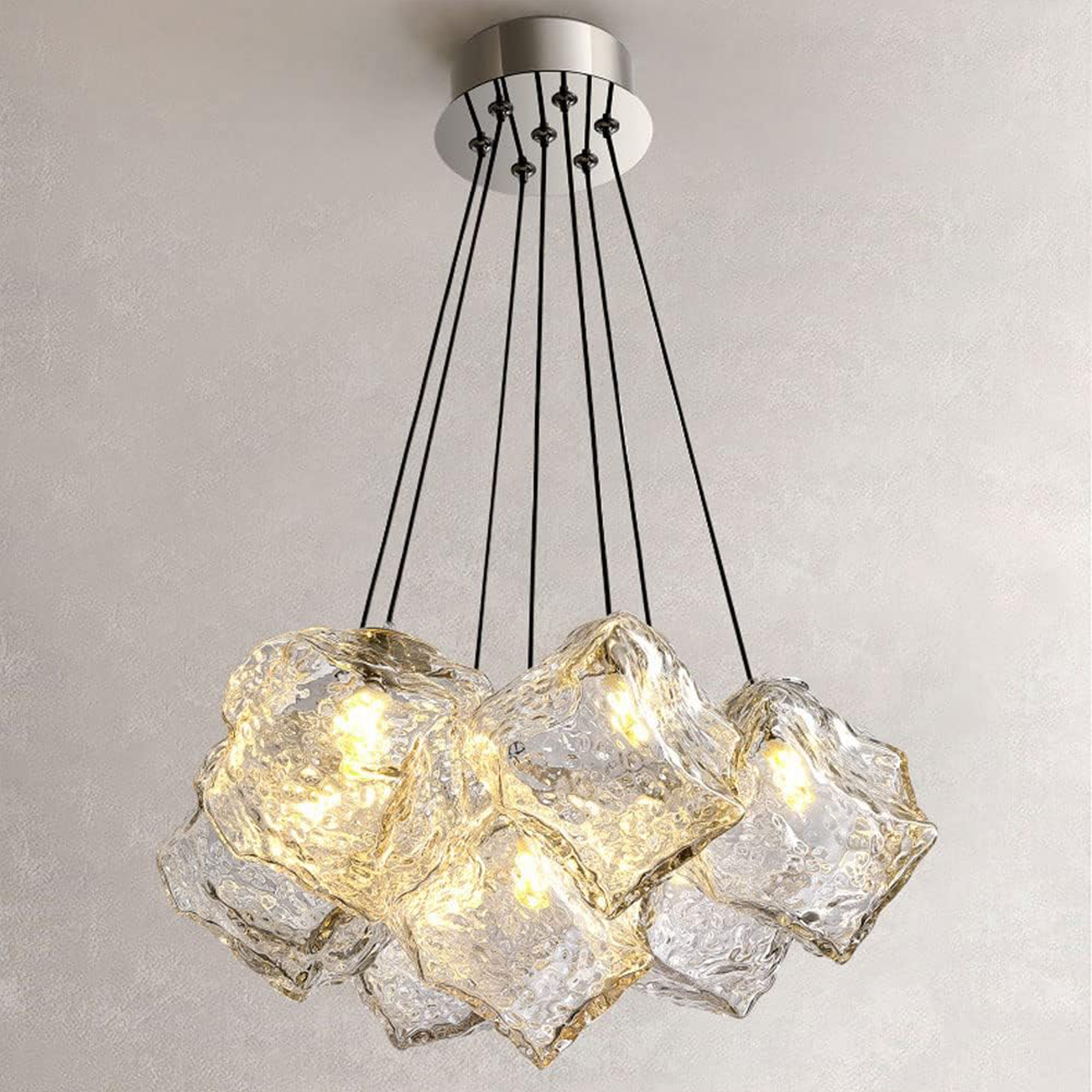 Cu un design spectaculos si un finisaj cromat lucios, aceasta lustra suspendata ECOLUCE este construita in jurul a 7 surse de lumina, distribuite armonios in forma de glob. Elementele din sticla cu textura neregulata creeaza un joc interesant de reflexii, aducand un plus vizual incaperilor mari precum livingul sau zona de dining. Functioneaza cu becuri E27 (neincluse). Inaltimea reglabila (pana la 100 cm) permite adaptarea la diverse spatii si tipuri de tavan. Caracteristici esentiale: 7 surse de lumina – acoperire ampla, ideala pentru incaperi generoase Functioneaza cu becuri E27 (nu sunt incluse) Lungimea de 35 cm si inaltime reglabila – potrivita pentru zone centrale Finisaj cromat lucios – aspect ordonat si atragator Se monteaza pe tavan si este recomandata pentru interior Ideala ca lustra cu bec pentru living, zona de dining sau bucatarie open-space O alegere eficienta pentru cei care vor lumina buna si un punct de atractie in acelasi timp.